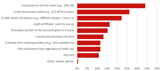 Survey Question: If you were browsing custom apparel or merchandise online, what would most motivate you to purchase more than one item?